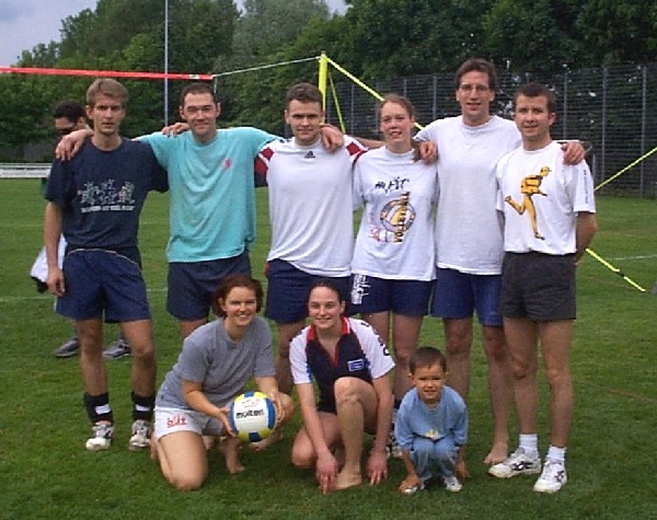 | Samstag vormittag wurden noch schnell die Felder und die Musikanlage aufgebaut und die letzten Vorbereitungen getroffen, damit es dann endlich um 13°° losgehen konnte. Leider gab es hier noch eine Verzögerung, da wir noch auf 2 Mannschaften warteten, aber dank des Handyzeitalters, sagten beide Teams ihre Teilnahme in letzter Minute noch ab. So startete das Turnier mit nur 15 Volleyballmannschaften. Die Gruppen kamen auch dieses Jahr wieder aus allen Teilen Deutschlands, von Köln -Bonn bis Altötting, sowie natürlich die Teams aus den "Nachbar Gemeinden". Die Mannschaften tobten sich auf dem englischen Rasen von Liederbach aus und boten, bei nicht gerade schönem aber trockenem Wetter am Samstag, herrliche Volleyballspiele. Denn die Wettermeteorologen sagten für Samstag Regen, Regen und noch mal Regen voraus. Und so wurde der Turnierleiter sogar zum Prediger: " Und Gott muss ein Volleyballer sein". Der Samstag mit dem offiziellen Teil des Turniers neigte sich dem Ende zu, und jeder hatte seinen Spaß gehabt. Doch das Orga -Team hat sich zum krönenden Abschluss des Abends noch eine Besonderheit einfallen lassen. | ||||||