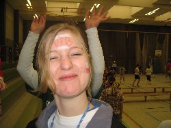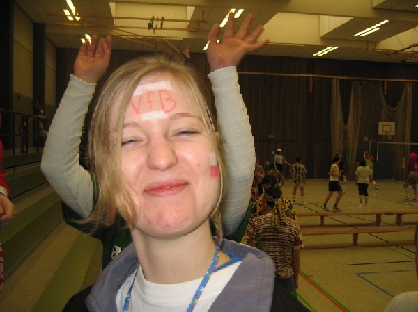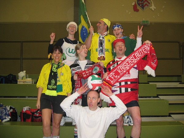 Niederjosbach in Eppstein teil. Am Samstag, den 21. Februar 04 trafen sich 14 als Fußballfans verkleidete VCLer bereits um 8:45 Uhr - also zu nachtschlafender Zeit - an der Liederbachhalle. Bereits hier wurden die Flaggen geschwenkt und die Fangesänge geübt. Los ging es dann um 9:30 Uhr in Eppstein mit einer Polonaise und Einspielen bevor um 10 Uhr die Spiele offiziell begannen. |