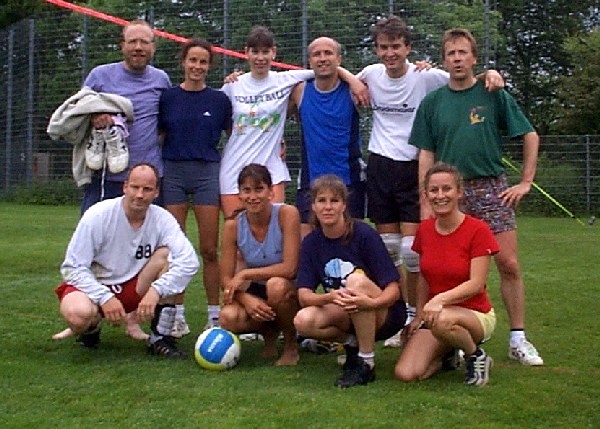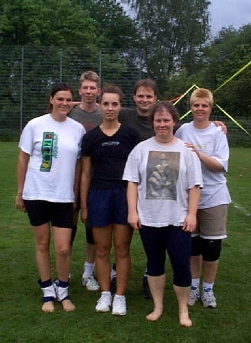 | Samstag vormittag wurden noch schnell die Felder und die Musikanlage aufgebaut und die letzten Vorbereitungen getroffen, damit es dann endlich um 13°° losgehen konnte. Leider gab es hier noch eine Verzögerung, da wir noch auf 2 Mannschaften warteten, aber dank des Handyzeitalters, sagten beide Teams ihre Teilnahme in letzter Minute noch ab. So startete das Turnier mit nur 15 Volleyballmannschaften. Die Gruppen kamen auch dieses Jahr wieder aus allen Teilen Deutschlands, von Köln -Bonn bis Altötting, sowie natürlich die Teams aus den "Nachbar Gemeinden". Die Mannschaften tobten sich auf dem englischen Rasen von Liederbach aus und boten, bei nicht gerade schönem aber trockenem Wetter am Samstag, herrliche Volleyballspiele. Denn die Wettermeteorologen sagten für Samstag Regen, Regen und noch mal Regen voraus. Und so wurde der Turnierleiter sogar zum Prediger: " Und Gott muss ein Volleyballer sein". Der Samstag mit dem offiziellen Teil des Turniers neigte sich dem Ende zu, und jeder hatte seinen Spaß gehabt. Doch das Orga -Team hat sich zum krönenden Abschluss des Abends noch eine Besonderheit einfallen lassen. | ||||||
