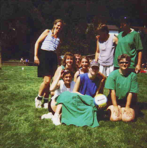 Trainer's Gütesiegel:'eines meiner Schäfchen würdig'. Damit Dieter wenigstens den Samstag Abend genießen konnte (Stichowort: ehemalige Tante) hatte er - nicht unpfiffig - vorgesorgt: Zunächst wurde 'Teichkontrolle' gemacht, damit sich auch niemand in trauter Zweisamkeit auf ein lauschiges Plätzchen am romantischen Teich versteckte. Wie peinlich, als dort tatsächlich ein Pärchen kuschelte, das so aussah wie . Glücklicherweise waren sie es nicht und wir konnten unseren Spaziergang fortsetzten! Ausserdem engagierte Dieter einen Co-Trainer (nachdem unser Physiotherapeut ja nicht zum Einsatz kam, weil 'sein' Schäfchen schon abgereist war ), damit dieser wenigstens auf eins der schwarzen Schafe aufpassen sollte. Allerdings hat er damit wohl den Bock zum Gärtner gemacht . So Co-Trainer haben aber auch ihr Gutes: Als erstes wurde noch Samstag abend Konditionstraining verordnet: Tanzen bis zum Morgengrauen! Dieser Aufforderung konnte nicht mal unser oberster Tanzmuffel widerstehen Anschliessend musste er, der totalen Erschöpfung nahe, ins Zelt gebracht werden (Wie ist er bloss über den Zaun gekommen ??) Aber auch spielerisch müssen die Damen aufgefallen sein: Schon auf dem Weg zum ersten Spiel am Sonntag Morgen wurde Dieter von wildfremden Männern angesprochen, wer denn bei uns stellen würde. Ob er das selber schon wußte ? Jedenfalls hatte er seinen Hauptangreiferinnen vor dem Tunier angedroht, daß sie diesmal stellen müßten ( woraufhin sie heimlich im Garten geübt haben .). Die 'langen Nächte' waren dem Volleyball Spielen scheinbar sehr zuträglich: Wieselflink bewegten sich jeweils sechs Spielerinnnen über das Feld, legten und schlugen die Bälle in die Ecken und auf die Linien, unerreichbar für die Gegnerinnen ( ok, ok, ich neige zu Übertreibungen). Jedenfalls setzte sich die Mannschaft erstaunlich gut gegen die Bezirksliga spielenden Mannschaften durch wenn auch, wie üblich, kaum eine Gelegenheit zum Tie-break ausgelassen wurde - aber schließlich wollten wir alle mal spielen !! |