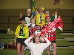 Niederjosbach in Eppstein teil. Am Samstag, den 21. Februar 04 trafen sich 14 als Fußballfans verkleidete VCLer bereits um 8:45 Uhr - also zu nachtschlafender Zeit - an der Liederbachhalle. Bereits hier wurden die Flaggen geschwenkt und die Fangesänge geübt. Los ging es dann um 9:30 Uhr in Eppstein mit einer Polonaise und Einspielen bevor um 10 Uhr die Spiele offiziell begannen. |